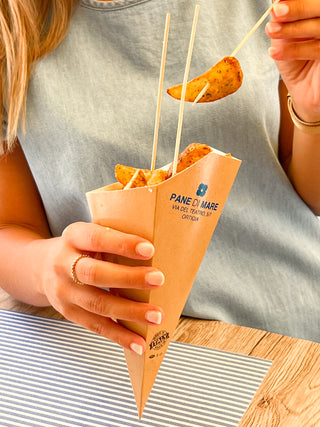 Il cuoppo fritto è la soluzione perfetta per servire pesce e fritti nello street food, unendo praticità e tradizione. Realizzato con materiali resistenti al calore e all’unto, garantisce una presa comoda e mantiene il prodotto croccante, rendendolo ideale per il consumo in movimento durante eventi, mercati e street food festival.